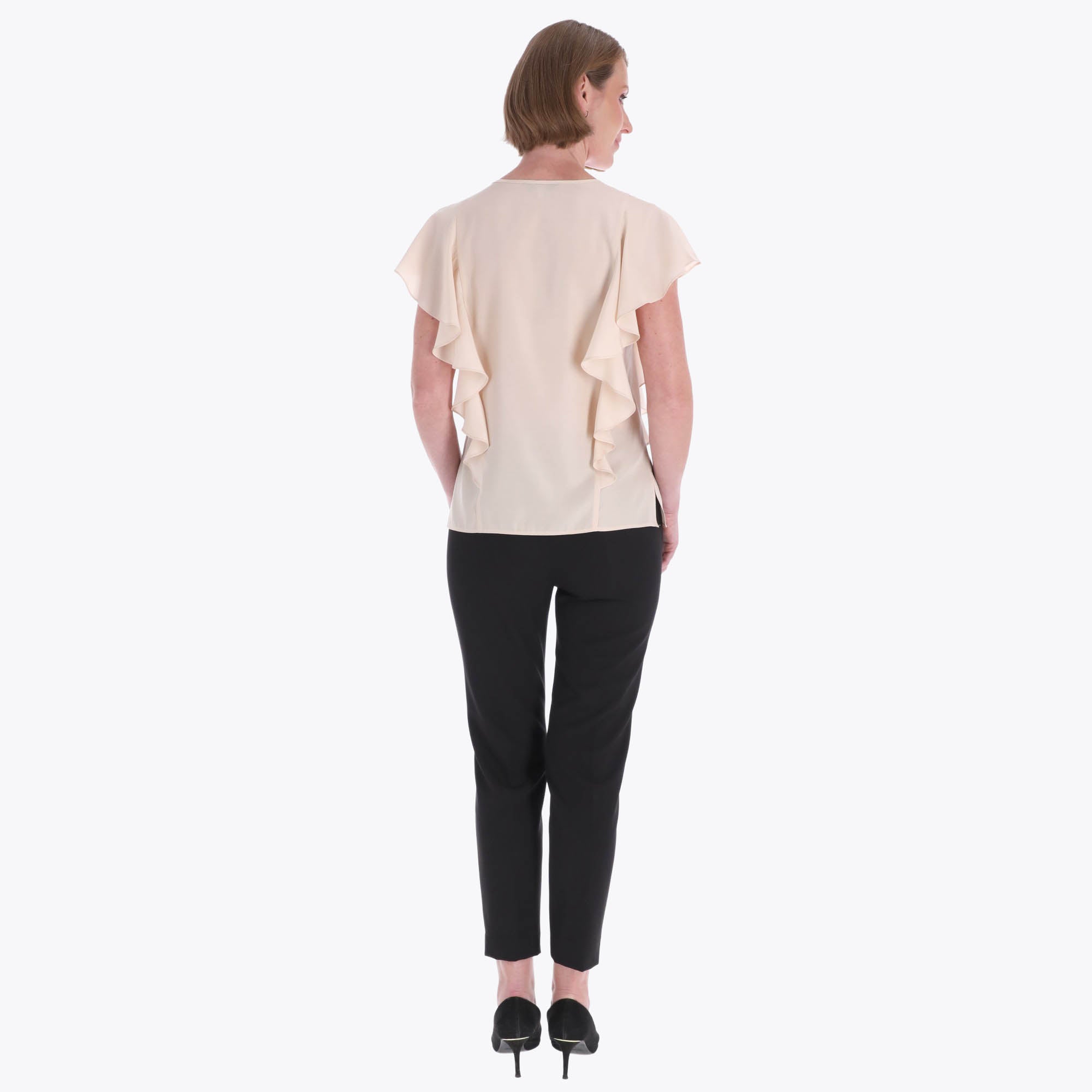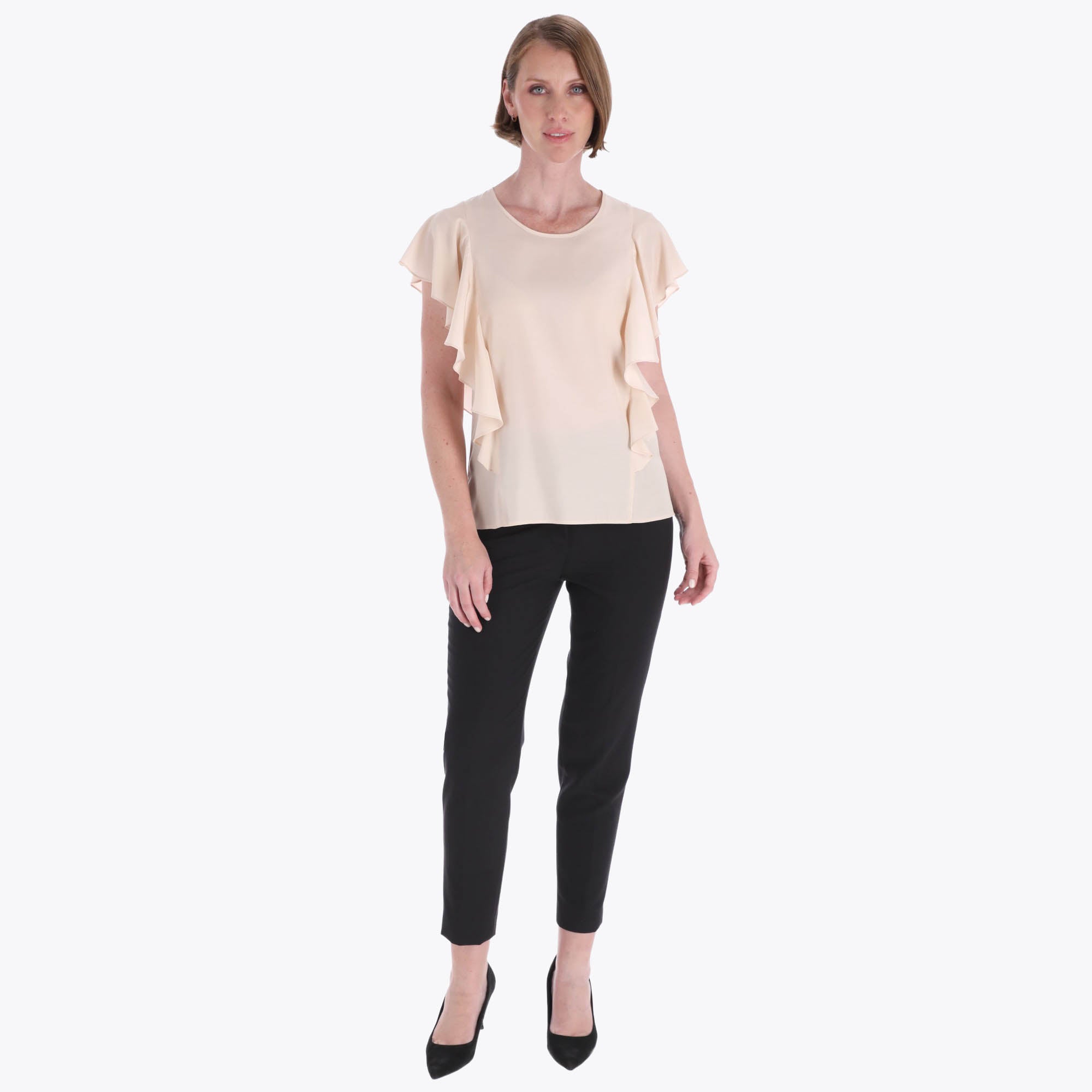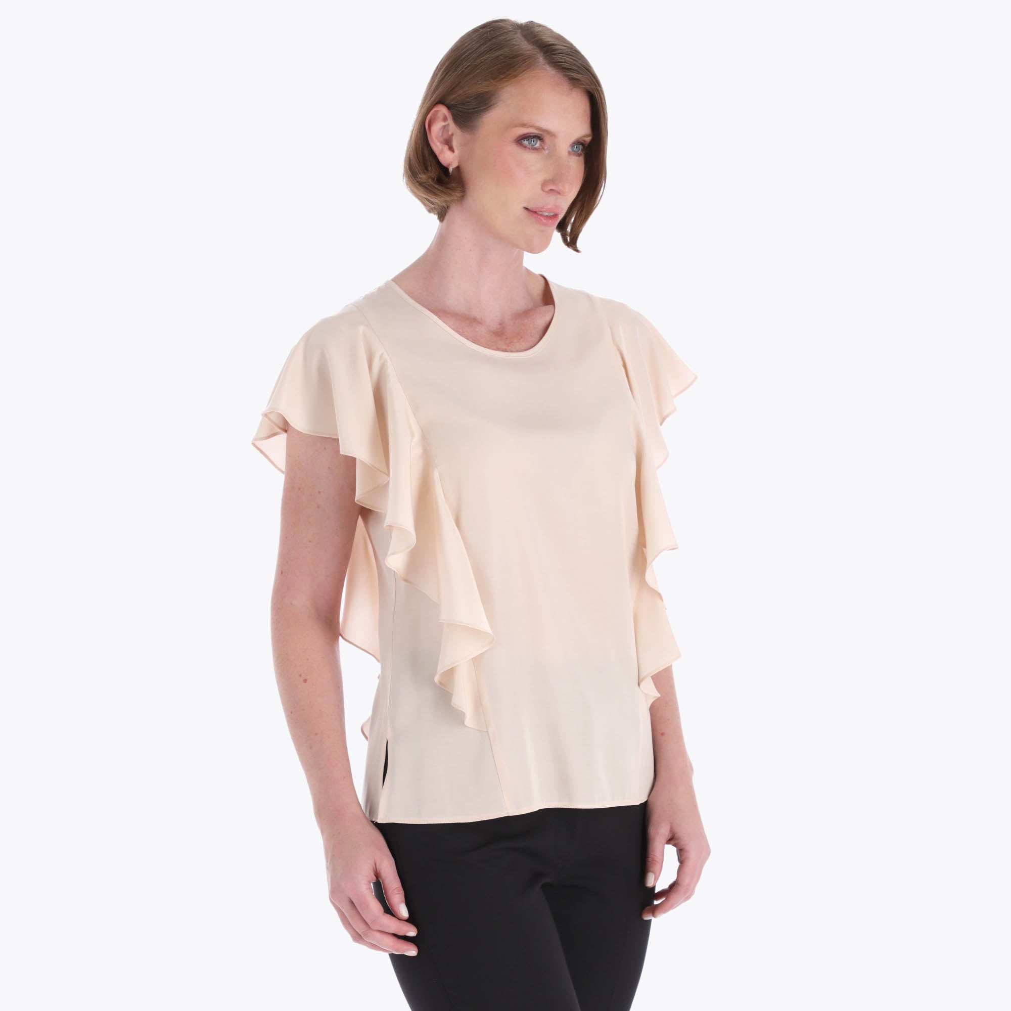 Blusa Escote Redondo con Escarolas en Costados Tejido Plano